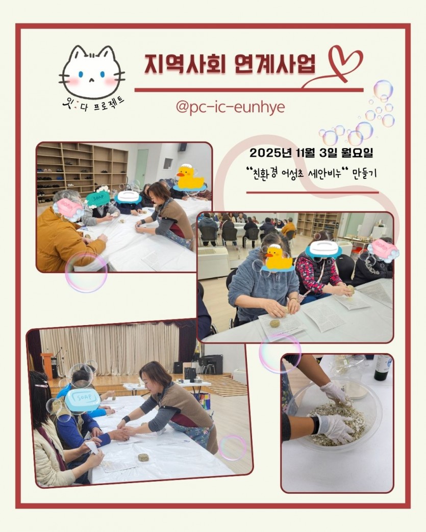 '친환경'과 '지속 가능'으로 우리 생활 속에 작은 것부터 시작할 수 있도록, 지구를 보호하는 방법을 연구하고 널리 알리는 활동을 하고 계십니다. 저희 은혜의집에 재능기부로 비누 만드는 프로그램과 친환경이 갖고 있는 장점에 대해 알리고 싶어하셨습니다.