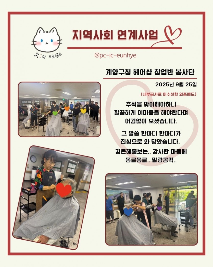 [잇다] 지역사회 연계사업 프로젝트 페이지 정보 작성자 : 관리자 쪽지보내기 자기소개 아이디로 검색 전체게시물 쪽지보내기 자기소개 아이디로 검색 전체게시물 댓글 0건 조회 72회 작성일 2025-09-29 10:42 본문 #인천#서구#심곡#서구청역#노숙#노숙인#시설#봉사#재능기부#후원#직업재활#자립#사후관리#잇다#잇다프로젝트#지역사회#연계사업#추석맞이#이미용#계양구청#헤어샵#창업반#봉사단#감동실화♥ 목록 댓글목록 댓글목록 등록된 댓글이 없습니다.
